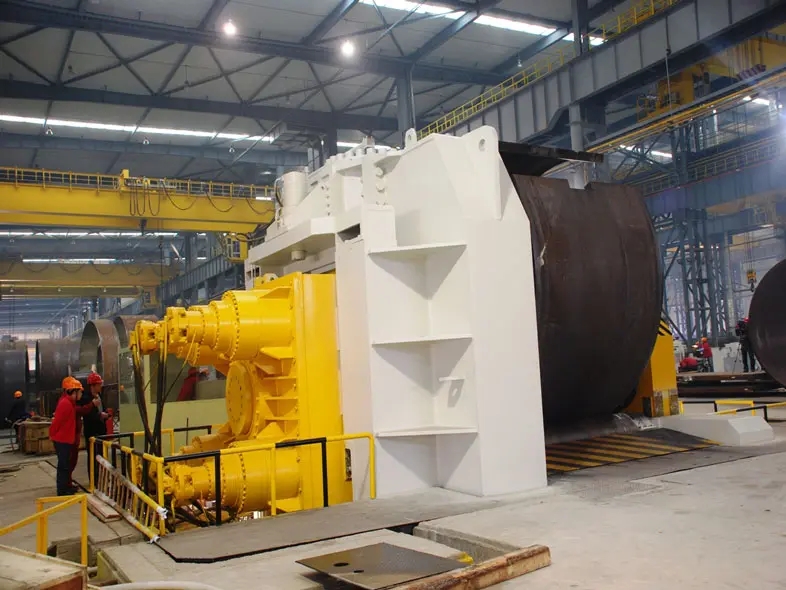 液壓全驅動水平下調式三輥卷板機,釆用右主油缸釆用上置,左主油紅下置式結構。該機三個工作棍均為主驅動輥,上輥由液壓馬達通過行星減速 機減速帶動回轉,下輥由液壓馬達通過行星減速機減速帶動回轉,行星驅動裝置與卷輾軸直接耦合,可以大幅度減少負載損失(無用功),使盡可能 大的功(有用功)用于卷板;上掘的升降采用液壓傳動,升降位移由計算機控制,自動調平,屏幕顯示,同步精度±0.2mm。下輥水平移動采用機械 傳動,水平移動通過蝸輪減速機減速,經螺桿、螺母副轉換為直線運動帶動。翻倒架的傾倒和復位采用液壓傳動上的尾部裝有液壓平衡機構,可以方便卸出卷制后的工件及筒體。設有固定式操作臺和遙控按鈕盒各一個,方便工人使用。設有安全聯鎖裝置,使操作更加安全。該機操作簡單、維 修方便,卷制精度高,是一種先進實用的大型卷板設備。